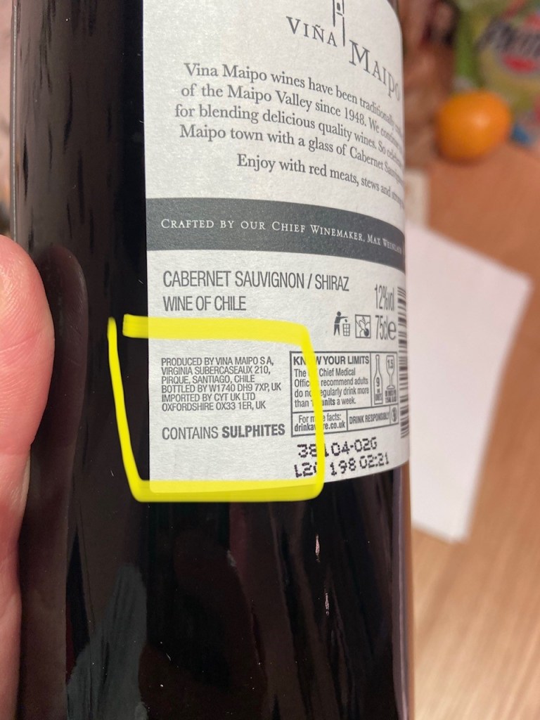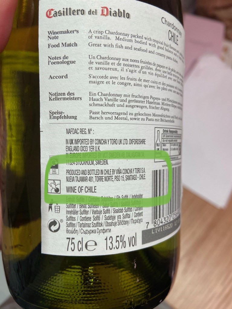 I love wine. If you do too, before you buy a bottle, have a look at the label and check out where it is bottled. Many wines are produced abroad – Chile, France etc – but bottled in the UK. Bottling in Blighty, or closer to where the wine is consumed, saves a considerable amount of energy during its transportation (glass is heavy). Below you can see the labels of two Chilean wines – one bottled in Chile (marked in green) then shipped here, another bottled in the UK (marked in yellow).
